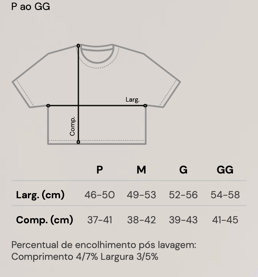 Tamanho: P, M, G e GG